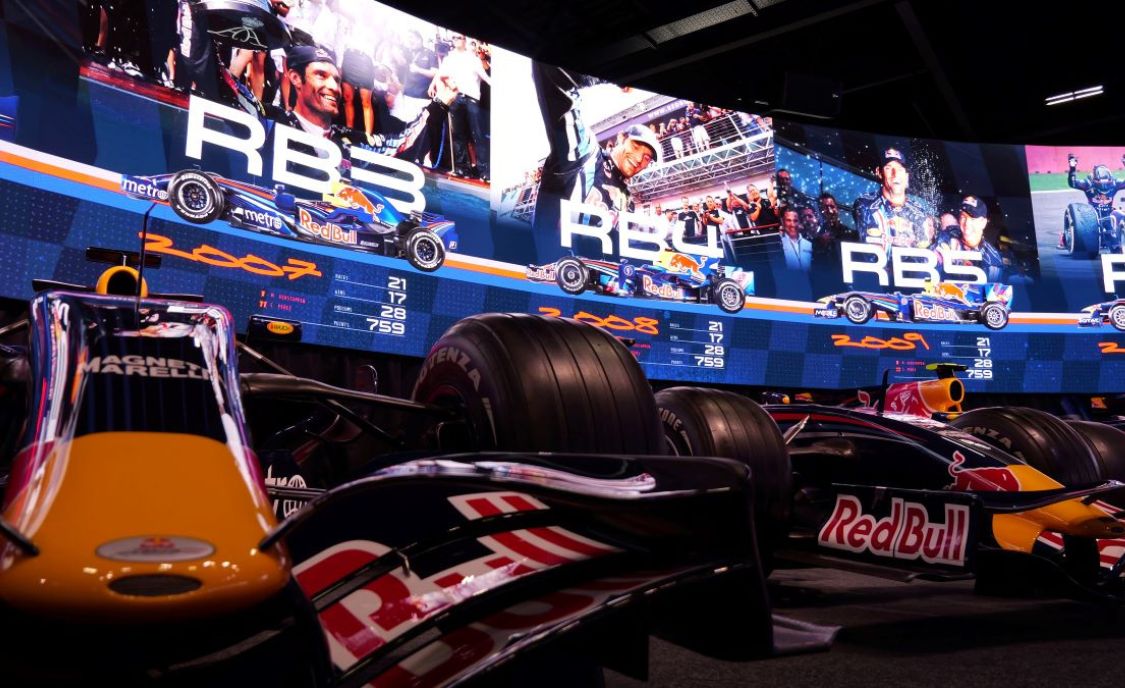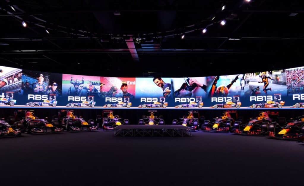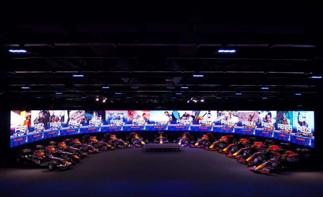 Situé au siège de l’équipe à Milton Keynes au Royaume-Uni, ce mur en forme de fer à cheval entoure une collection de voitures de F1 légendaires, dont celles du triple champion du monde Max Verstappen.